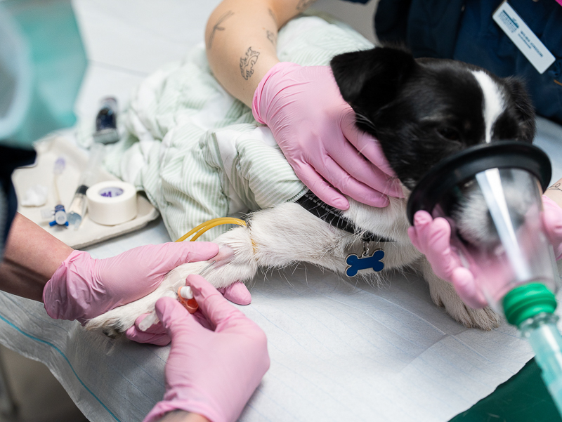 När medicinen har verkat ges narkosmedel via en kanyl i ett blodkärl och hunden intuberas med en andningsslang. Syrgas och narkosmedel tillförs via slangen för att upprätthålla narkosen. Narkosen anpassas individuellt för varje hund. Hänsyn tas till ras, ålder, vikt, allmäntillstånd och eventuella sjukdomar.