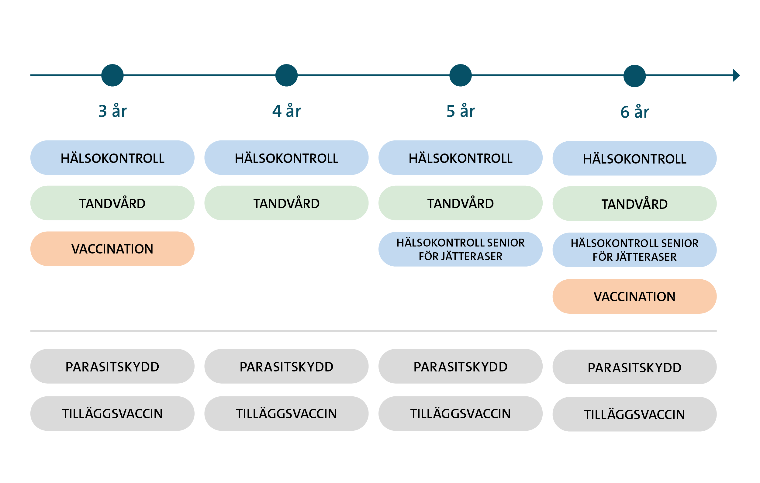 Jätteraser, som ofta har en vuxenvikt över 45 kg, åldras snabbare än små till medelstora raser och brukar räknas som seniora redan från fem års ålder. För dessa rekommenderar därför vi Hälsokontroll Senior som inkluderar blodprov.