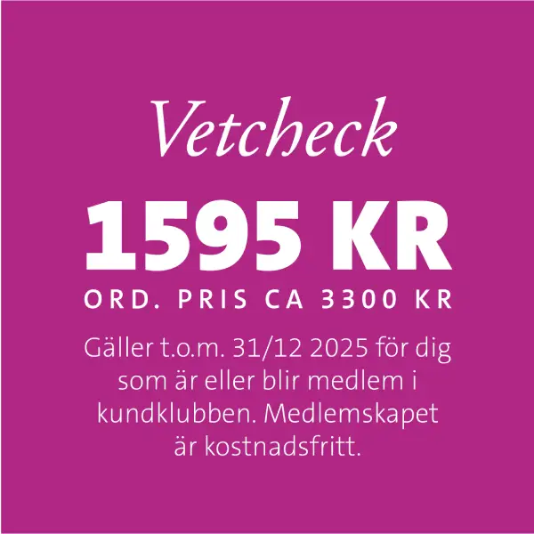 Det finns många fördelar med att upptäcka hälsoproblem i tid. Eventuella skador hinner till exempel inte bli lika allvarliga och nödvändig behandling kan påbörjas på ett tidigt stadium. Som medlem får du Vetcheck till rabatterat pris fram till den 31 december.
